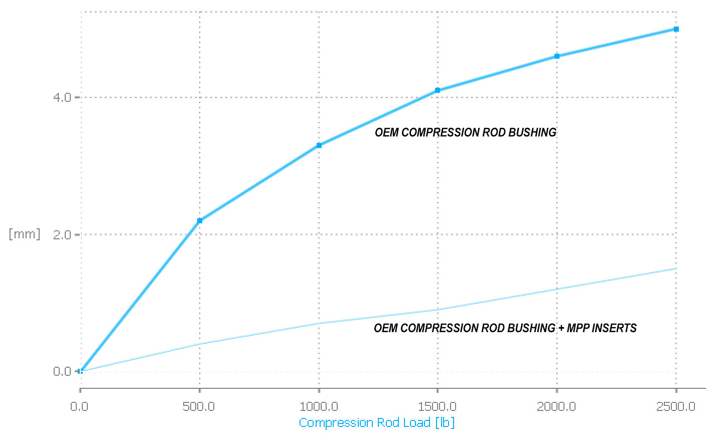 The data shows that the 500-2000lb range is where our inserts make the biggest difference – beyond that the void has fully crushed and the rates are fairly similar. However, just look at that massive difference – at 1500 pounds of load the inserts remove 75% of the bushing’s deflection.