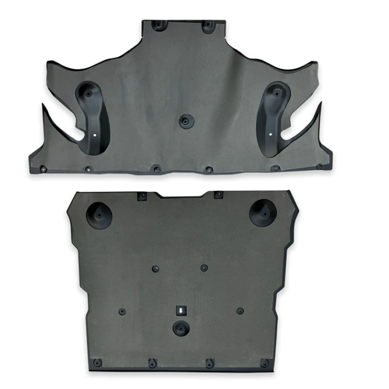 Hasplåtar till Tesla Model Y tillverkade i pulverlackad aluminium–magnesium med vägbullerreducerande uretan för en tystare kupé.